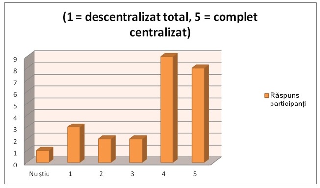 Conform răspunsurilor primite constatăm că la nivelul administraţiei publice locale procesele de achiziţie tind să fie cât mai centralizate – toate cele 17 primării mergând pe variantele foarte centralizat şi complet centralizat, în vreme ce la celelalte instituţii, procesele de achiziţii fiind destul de descentralizate.